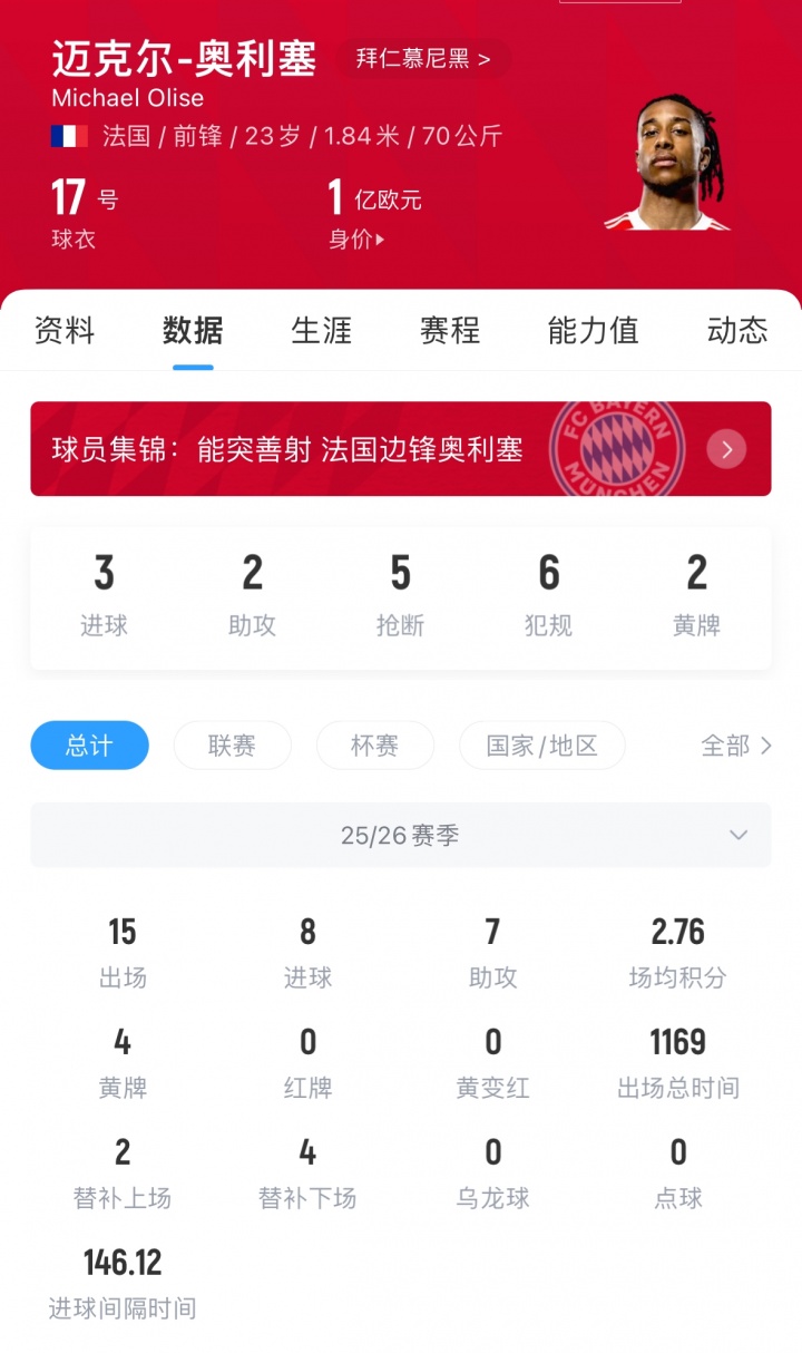奥利塞现年23岁,司职右边锋,他本赛季为拜仁出战15次,孝敬8球7助,他与拜仁的公约在2029年到期,现身价1亿欧。拜仁方面宣称意出门售奥利塞,并但愿在将来不绝留下他,据悉,奥利塞与拜仁莫得解约金条目。