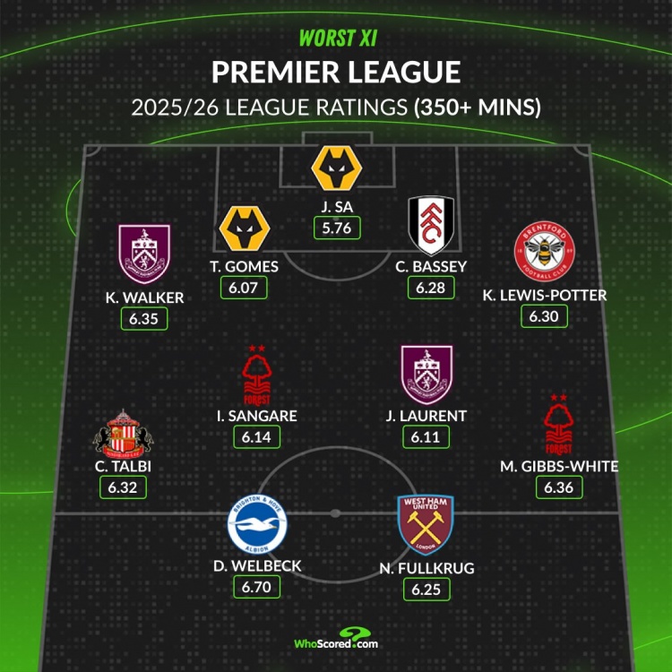 WhoScored本赛季于今英超最差威望(出场350分钟+):