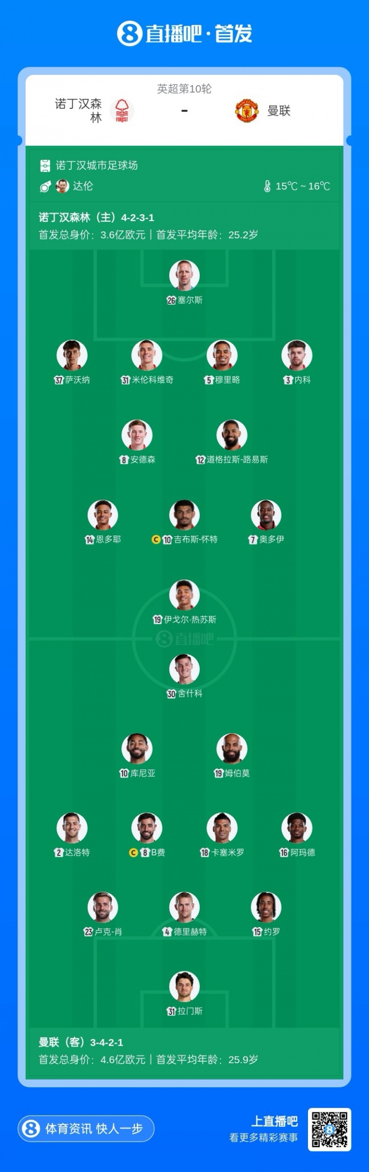 11月01日讯 北京技术今晚23点,英超第10轮曼联客战诺丁汉丛林,赛前首发声势照旧公布。