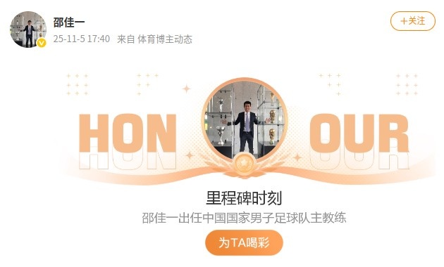 邵佳一的个东谈主微博更新了他新的里程碑手艺:邵佳一出任中国国度男人足球队主考验。