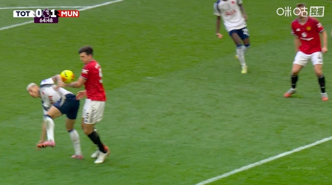 11月08日讯 英超第11轮,热刺vs曼联,比赛第65分钟,马奎尔在禁区内手臂触球,但裁判莫得暗示,VAR也莫得介入。
