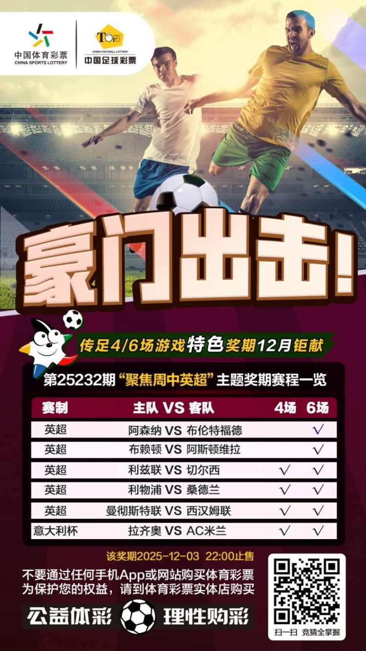 传足4/6场游戏特点奖期第25232期竞猜对象为周中英超和意大利杯1/8决赛,具体对阵:英超的阿森纳VS布伦特福德、布赖顿VS阿斯顿维拉、利兹联VS切尔西、利物浦VS桑德兰、曼彻斯特联VS西汉姆联,意大利杯的拉王人奥VSAC米兰。