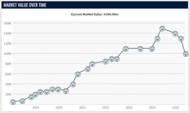 23/24赛季,福登在英超代表曼城出战35场获利19球8助(总额据53场27球12助),当选英超赛季MVP,个东谈主身价亦然涨到了1.5亿欧。上赛季福登碰到脚踝伤势,各项赛事(包括世俱杯)49场13球7助,身价从1.5亿跌回1亿欧。