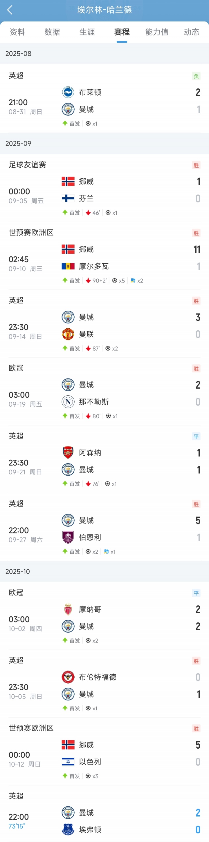 比赛第63分钟,哈兰德破门梅开二度,畅通11场比赛赢得进球,11场比赛打进了恐怖的21球!