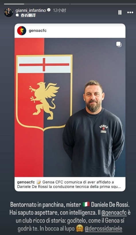 11月7日讯 德罗西昨日负责出任热那亚主帅,国外足联主席因凡蒂诺在我方的ins上向这位前罗马据说奉上了祝福。