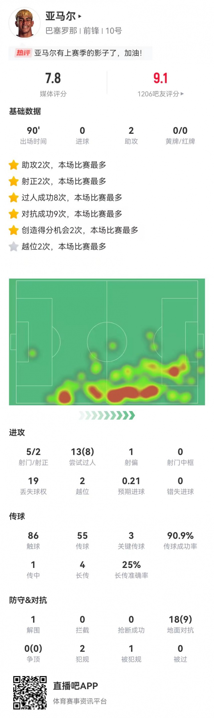11月23日讯 巴萨在本轮西甲4-0完胜毕巴,亚马尔本场数据如下: