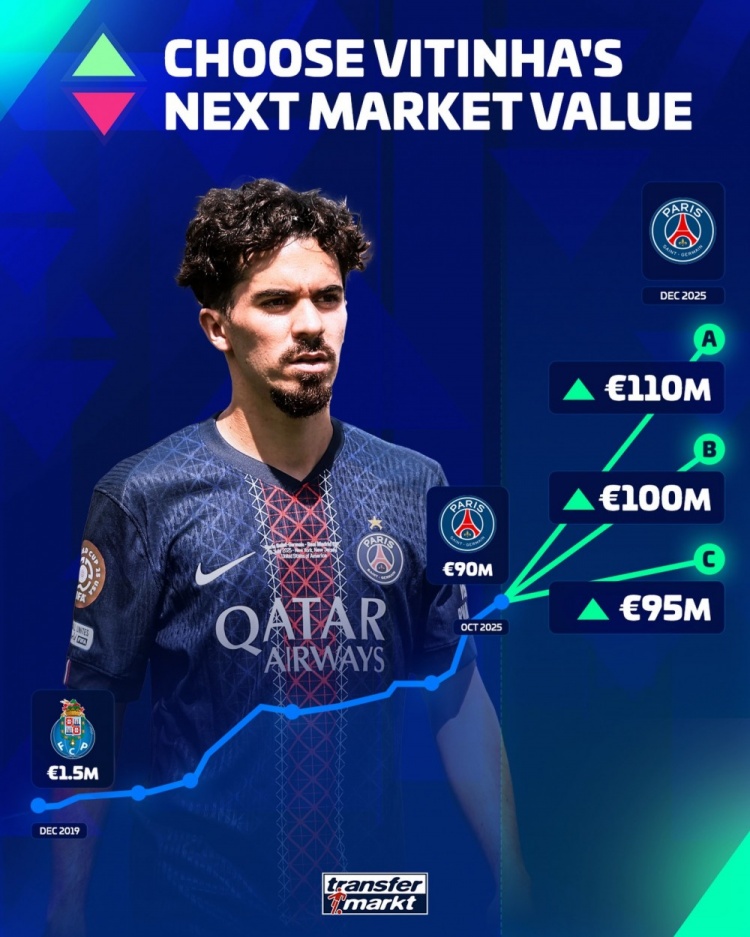 德转预热维蒂尼亚最新身价(当今9000万欧元):