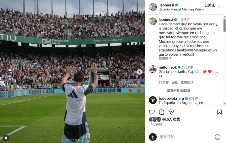 11月13日讯 梅西发布社媒,感谢了今天在埃尔切不雅看我方检会的球迷们。