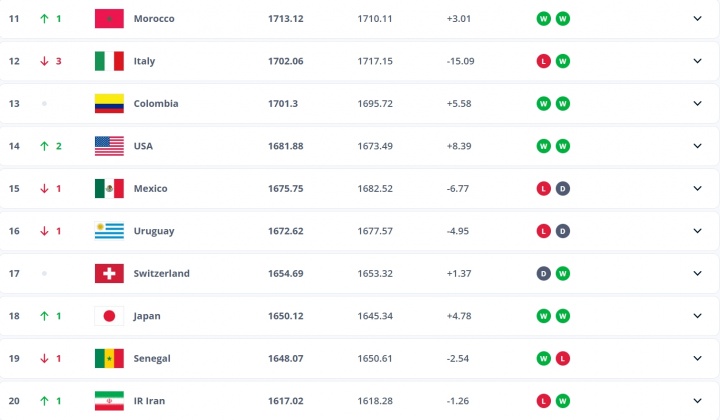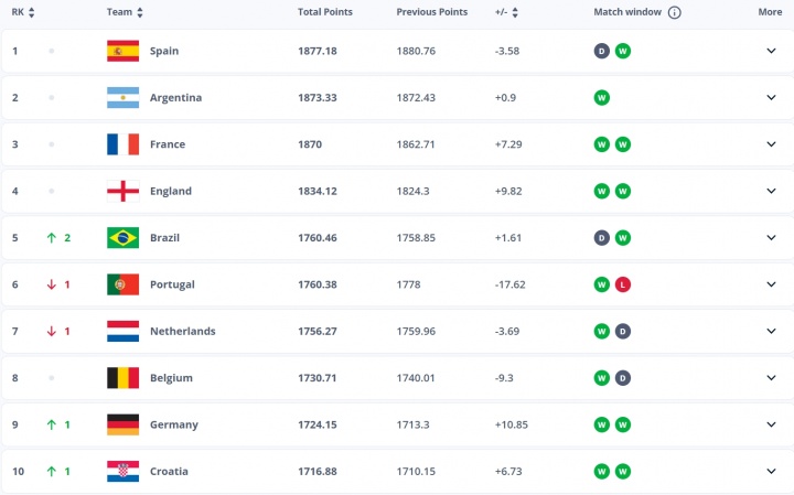11月19日讯 FIFA官方公布了新一期国度队寰宇名次,西班牙、阿根廷、法国仍位居前三,巴西飞腾2位至第5,德国升至第9,意大利下落3位,跌至第12。