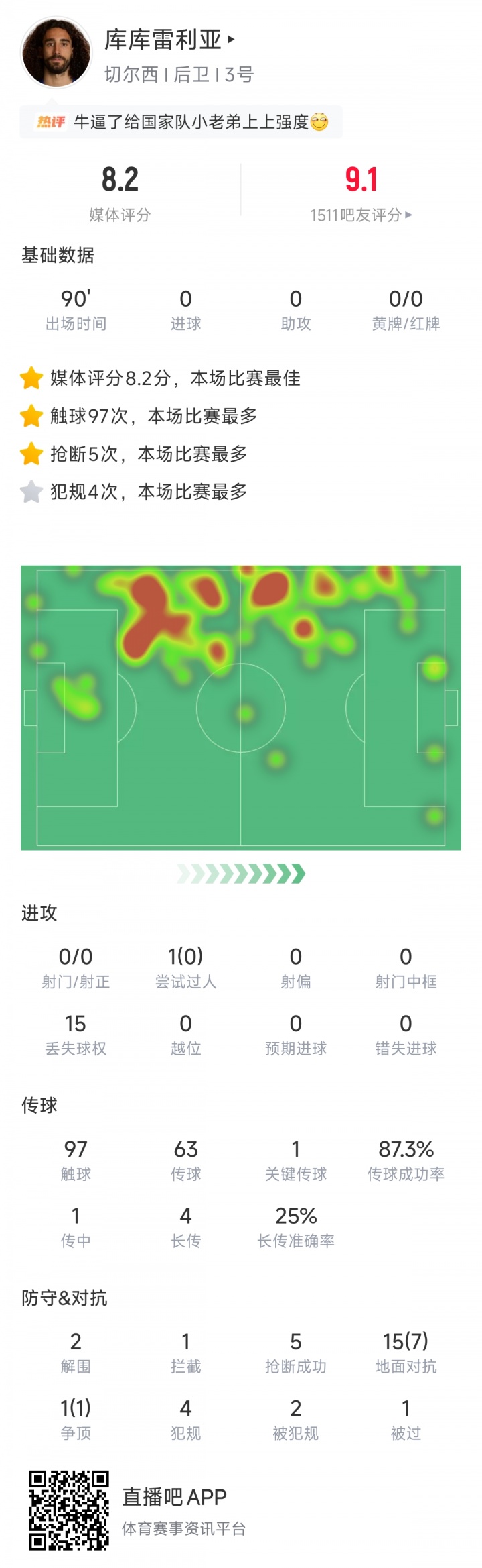 这一战库库雷利亚孝顺5次抢断2突围1约束,16次造反8次告捷,他也告捷当选欧冠官方评比出的本场比赛最好球员。切尔西的首粒进球便是来自他的传中盘算造乌龙,赛后库库雷利亚的评分亦然最高。