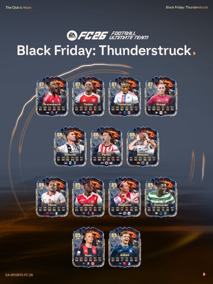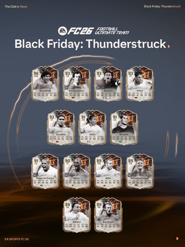 11月29日讯 北京手艺昨日晚间EA FC26发布了“玄色星期五”的最新活动——雷霆活动球员卡池,其中现役球员方面贝林厄姆、罗德里领衔,听说球员方面马拉多纳、贝肯鲍尔、马尔蒂尼等听说名宿也统共入选。