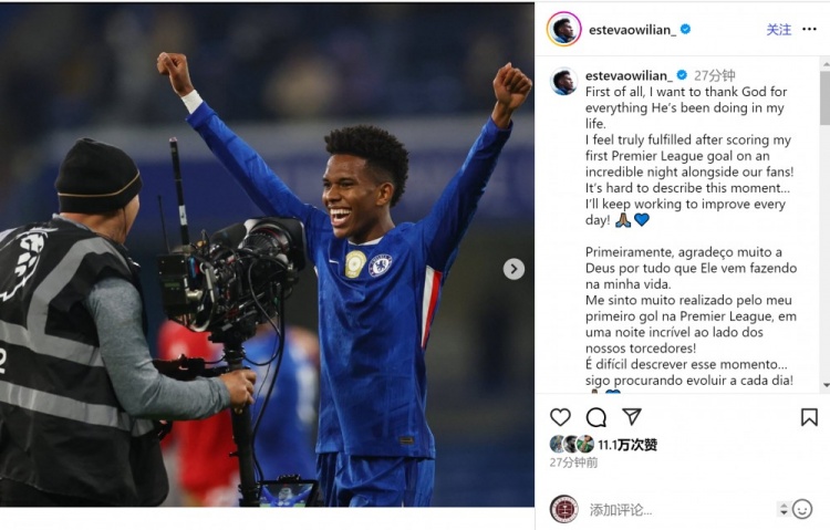 埃斯特旺社媒晒出庆祝的像片,配文:“当先,我要感谢天主在我性掷中所作念的一切。在与球迷共度的超卓之夜攻入个东说念主英超首球之后,我感到无比餍足!