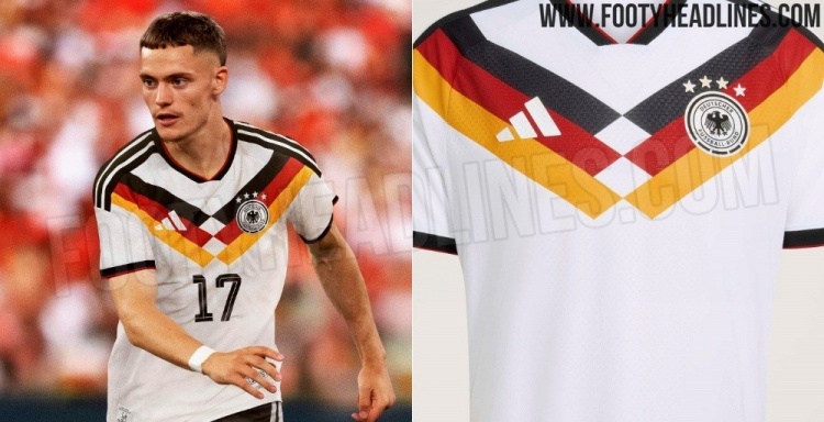 从曝光的图片来看,新球衣主体照旧是传统的白色。其中枢盘算灵感着手于德国队在1990年和2014年两次夺得天下杯冠军时所穿的经典球衣。最权臣的特征是胸前继承了源自德国国旗的黑、红、黄三色V形图案,从肩部蔓延至胸前上部。