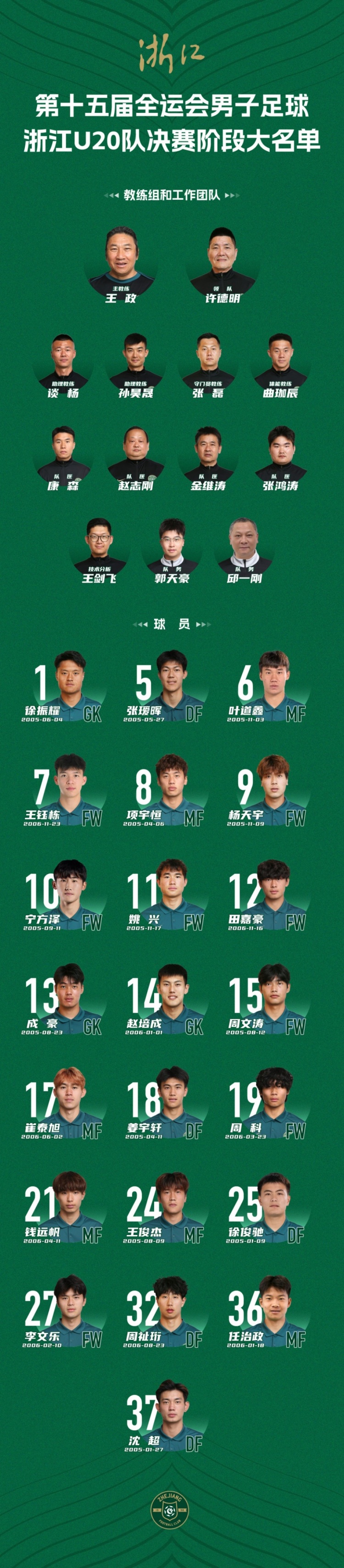 10月28日讯 第十五届全运会行将伸开男足U20决赛阶段的较量,浙江队本日公布参赛名单,其中包括了王钰栋和张瑷晖等球员。这支球队将由原浙江绿城主讲明王政挂帅,绿城旧将张磊、说念杨担任助理讲明。