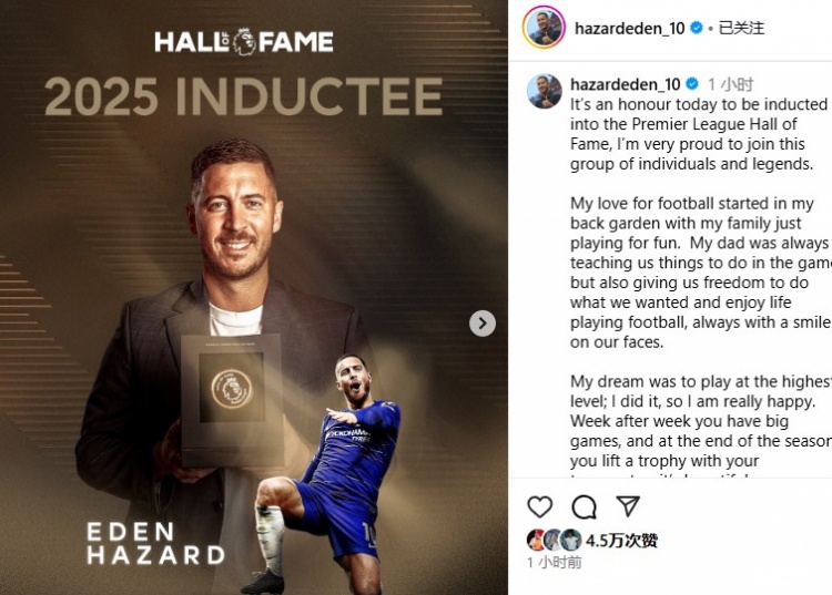 10月29日讯 英超官方告示,切尔西名宿阿扎尔入选英超名东谈主堂。阿扎尔更新社媒,谈到我方得奖的欢快之情。