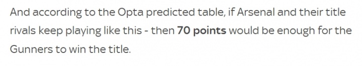 阐发Opta现在的最新揣摸,若是阿森纳偏捏争冠敌手陆续这么踢下去,那么枪手只需70分即可夺冠。