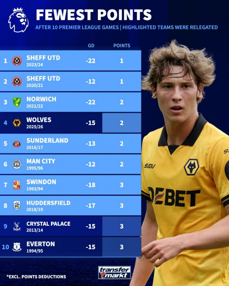 11月3日讯 转会阛阓盘货了英超历史前10轮事后最差战绩,其中本赛季狼队第四,其他前8球队最终均左迁。具体如下(积分,净胜球):