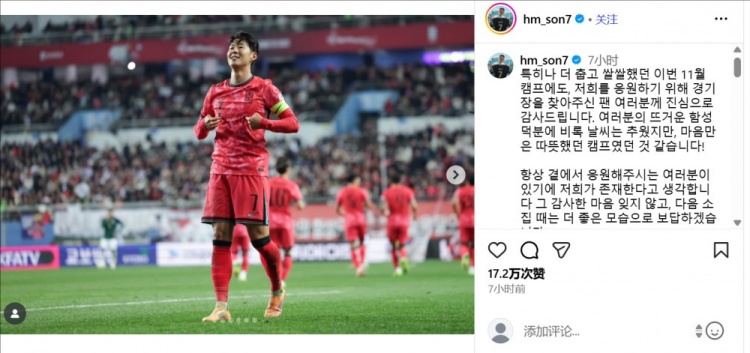 11月20日讯 孙兴慜更新外交媒体,感谢了在本次国度队集训本领来现场加油的韩国球迷。