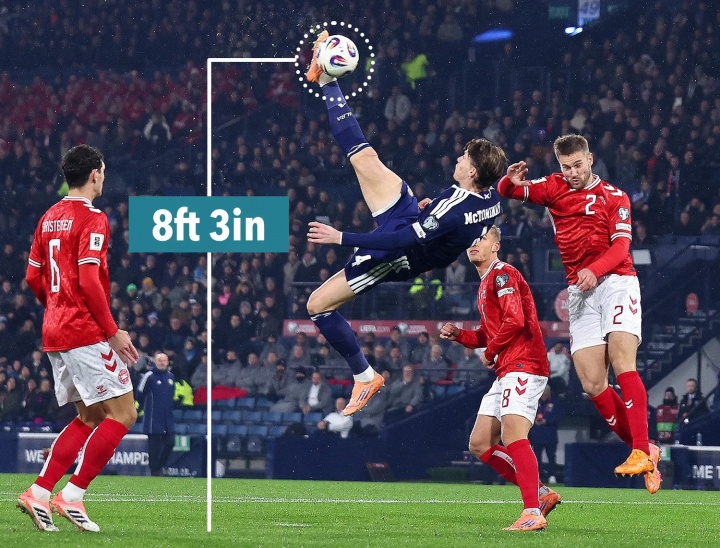 11月19日讯 欧洲区世初赛小组赛末轮,苏格兰4-2降服丹麦,晋级2026寰宇杯,麦克托米奈在比赛中打入一粒精彩倒钩。