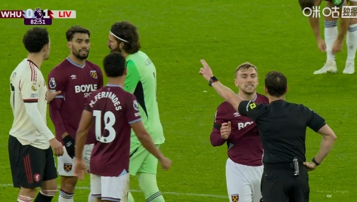 11月30日讯 英超第13轮,西汉姆联vs利物浦,帕奎塔动怒判罚连吃2黄被罚下。