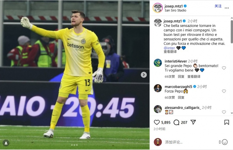 12月4日讯 海外米兰门将何塞普·马丁内斯在Instagram发文,谈到球队晋级意大利杯八强。