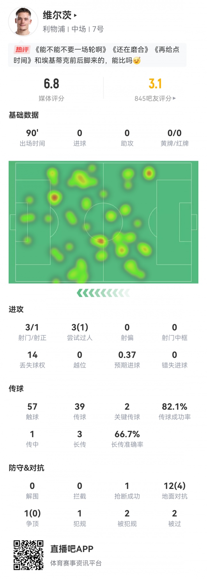 维尔茨未能展现出任何猛烈度。这位德国国脚14次丢失球权,13次抗争仅赢下4次(成效能31%)。下半场一次传球流毒后,他双手掩面——信心赫然已遭遇重挫。