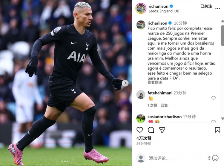 理查利森赛后也在社媒晒出本场相片,配文写说念:“很旺盛能在英超联赛中完成250场里程碑。我一直梦思着能在这里踢球,成为活着界顶级联赛中出场次数最多、进球最多的巴西球员之一是我的运道。更令东说念主旺盛的是,今天咱们取得了一场坚苦的比赛,是以目下要庆祝这一切,并以最好情状招待国度队比赛日。”