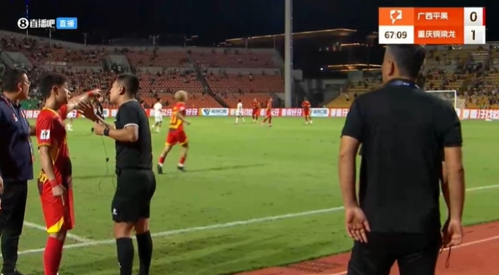 10月05日讯 中甲第25轮广西平果主场vs重庆铜梁龙比赛中,铜梁龙球员突围时踢到敌手肚子,现场字幕给出VAR介入了这次判罚,可能要判给广西点球,但是现场事故不断。