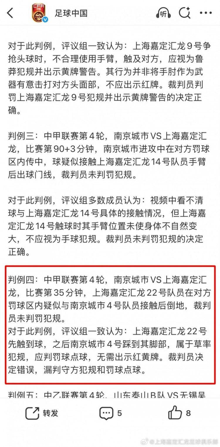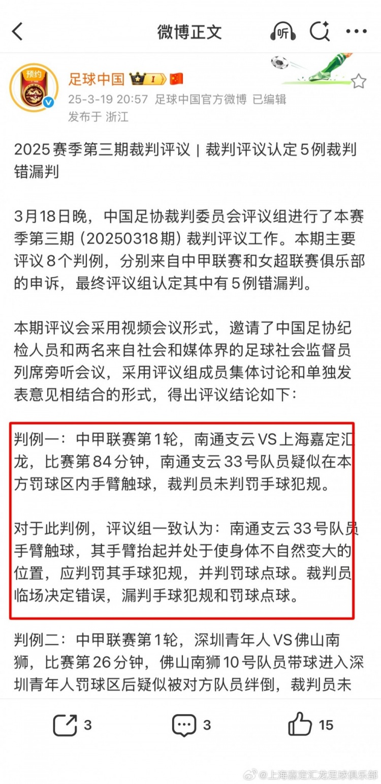 上海嘉定汇龙官方写说念:本赛季中甲联赛截止上轮,经中国足协裁委会评议组认定,共三次漏判给上海嘉定汇龙点球。