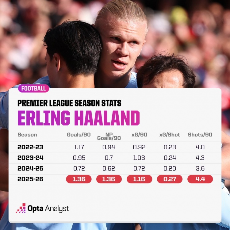 哈兰德本赛季创造英超生活新高的数据: