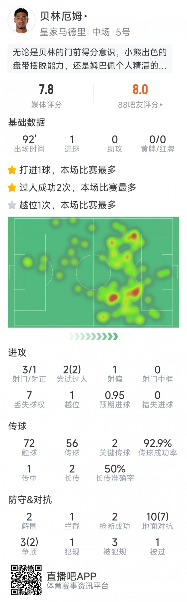 10月23日讯 在本轮欧冠,皇马1-0打败尤文,贝林厄姆打进惟一进球。以下为他在本场数据: