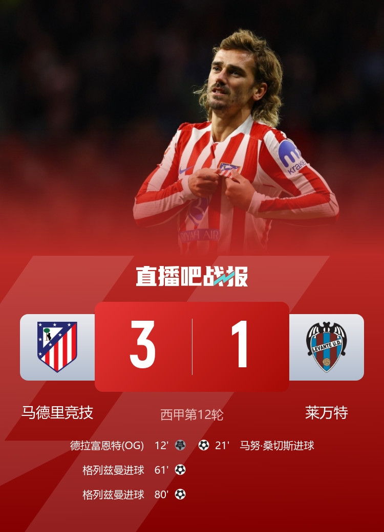 马竞本轮3-1打败莱万特,格列兹曼替补两球成为取胜元勋。