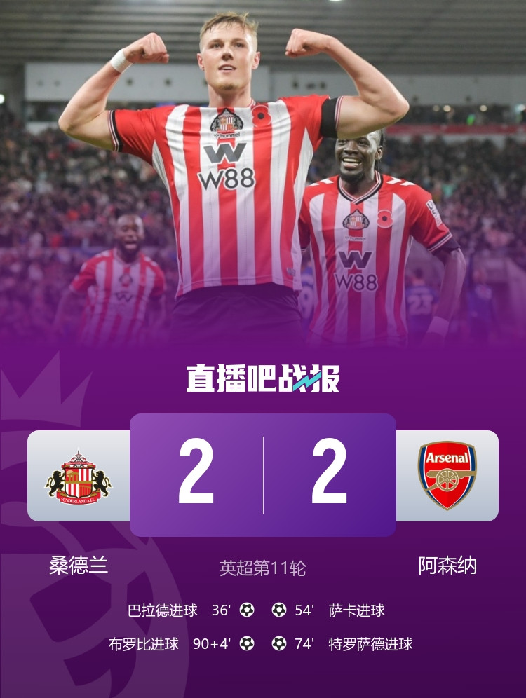 阿森纳本轮2-2战平桑德兰,布罗比补时绝平,阿森纳的连胜和零封记录齐罢了了!