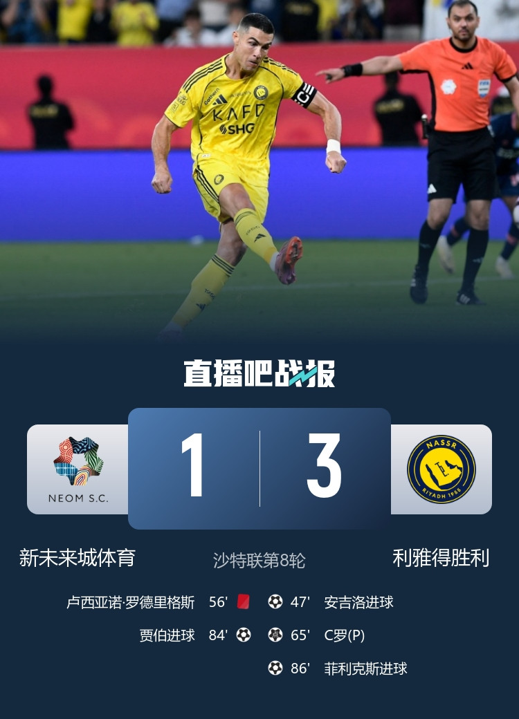 本轮沙特联,利雅得告成3-1打败新将来城体育,C罗、菲利克斯和安吉洛破门。