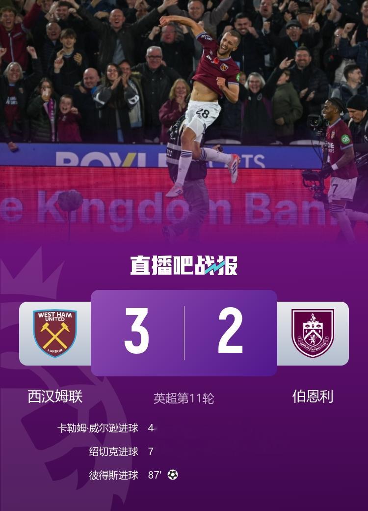 西汉姆本轮3-2惊悸打败伯恩利,西汉姆在经由此前低迷后久违地拿下两连胜。