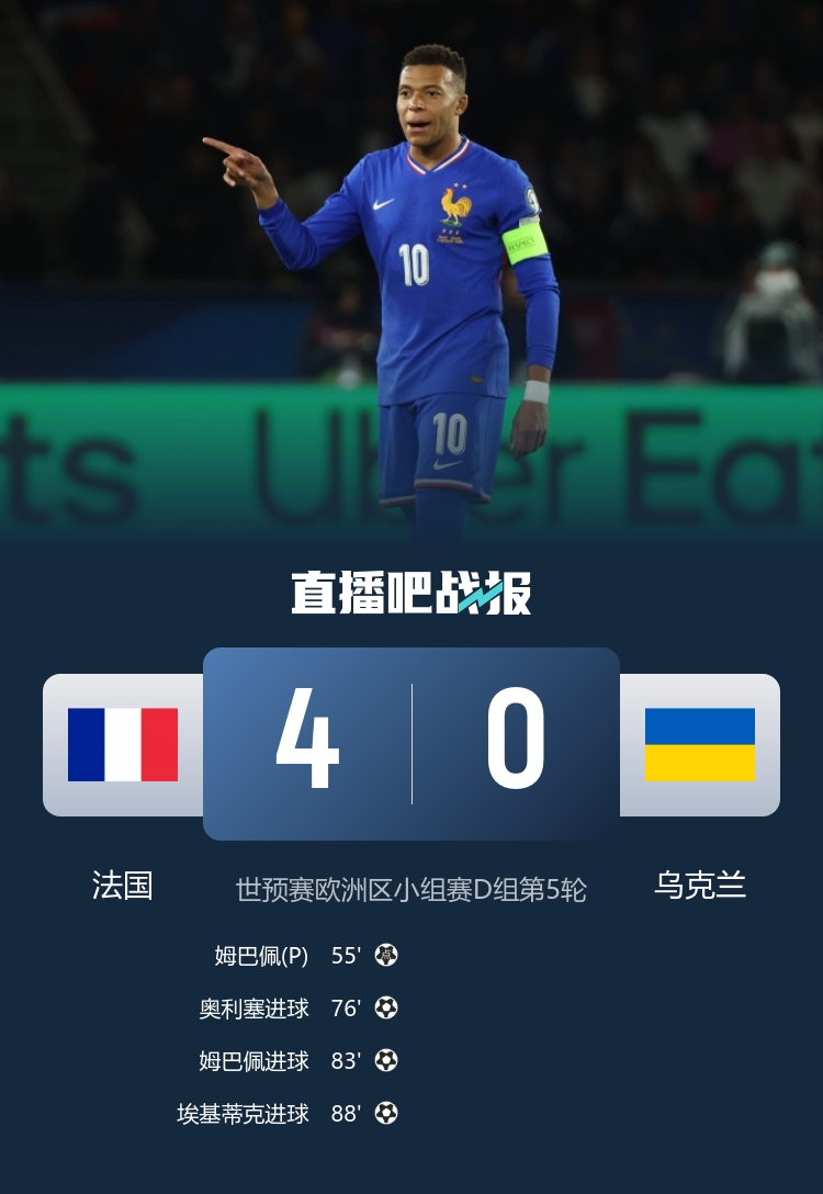 世初赛欧洲区D组,法国4-0横扫乌克兰,姆巴佩双响并解锁生活400球,法国队提前晋级寰宇杯!