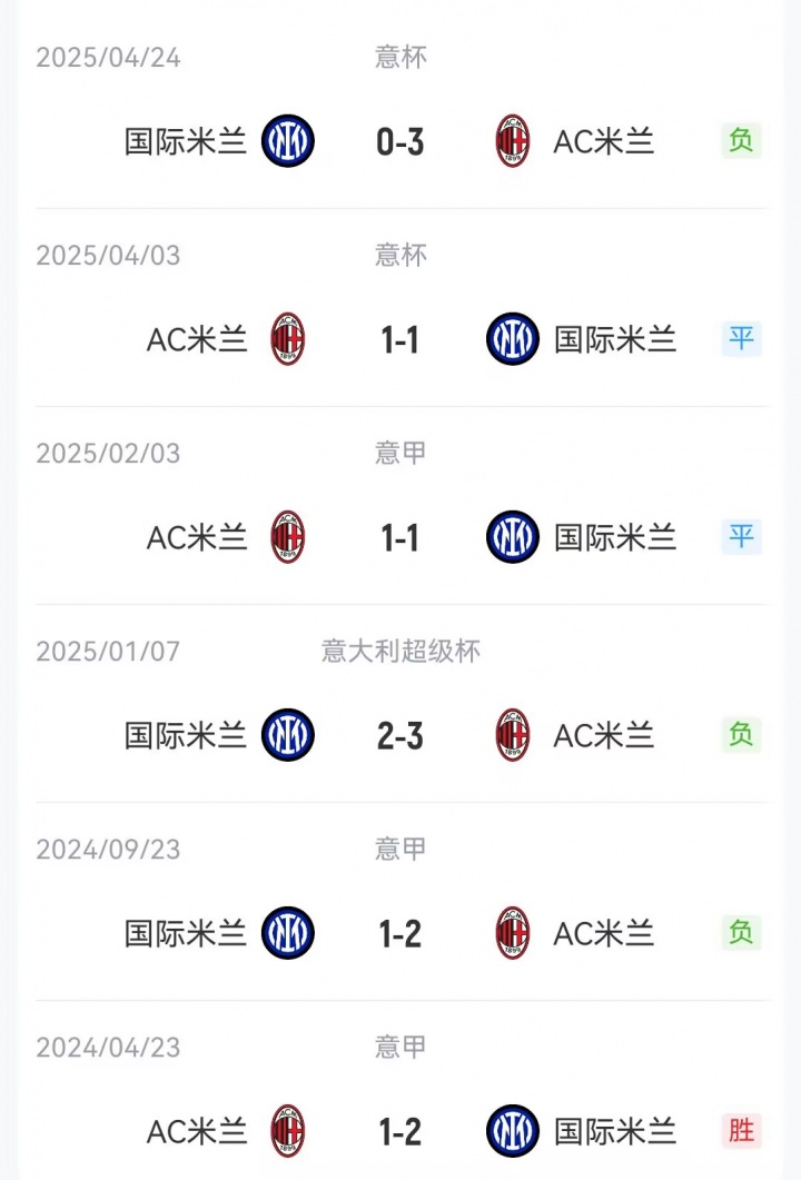 米兰德比总战绩方面:两边共进行229场交锋,米兰赢下其中75场,国米赢下其中85场,两边战平69场。