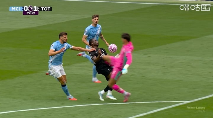 08月23日讯 英超第二轮,曼城镇守主场对阵热刺,比赛38分钟,特拉福德出击膝撞库杜斯,况且疑似手球犯规。库杜斯难受倒地后裁判没示意。